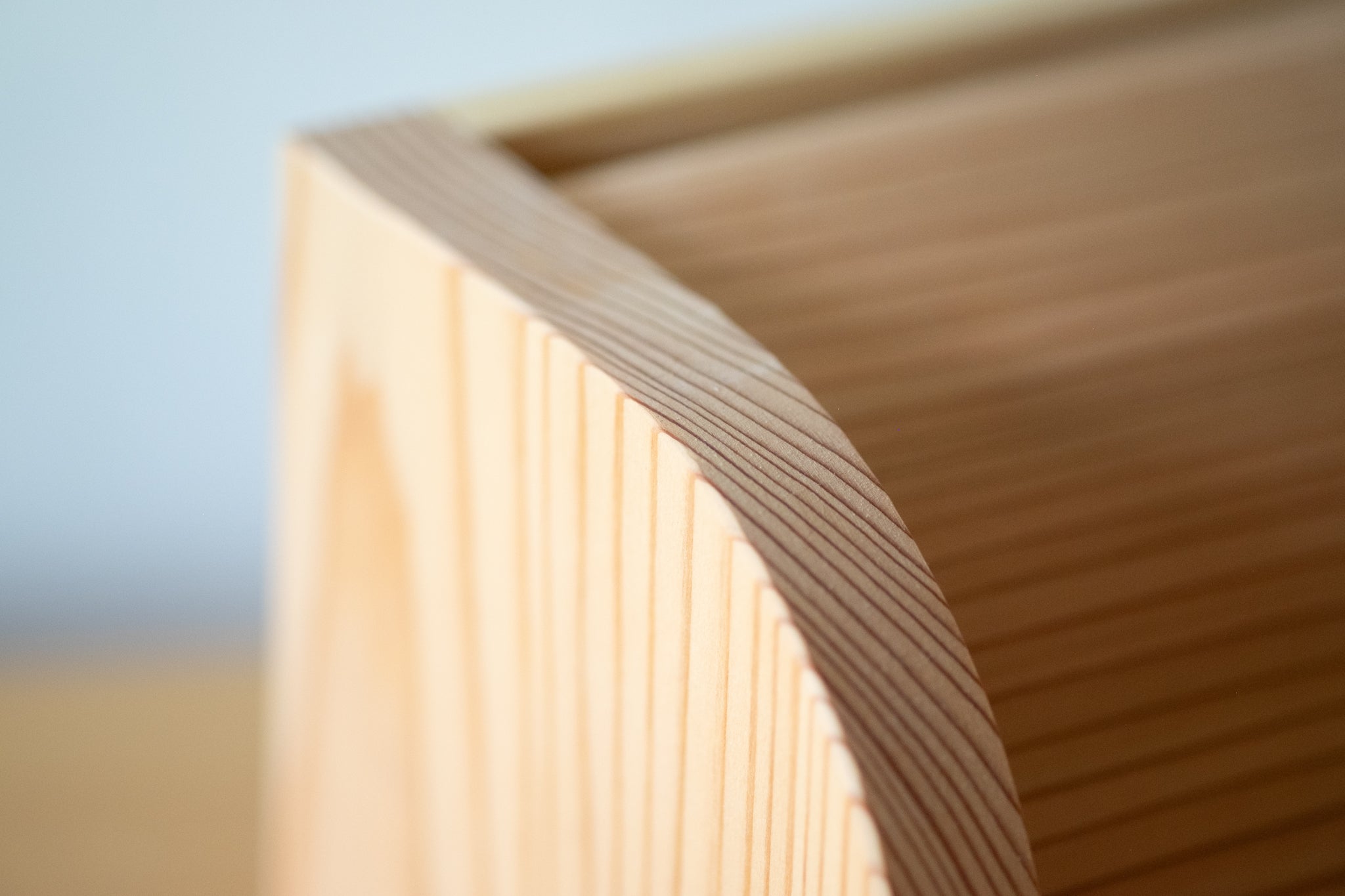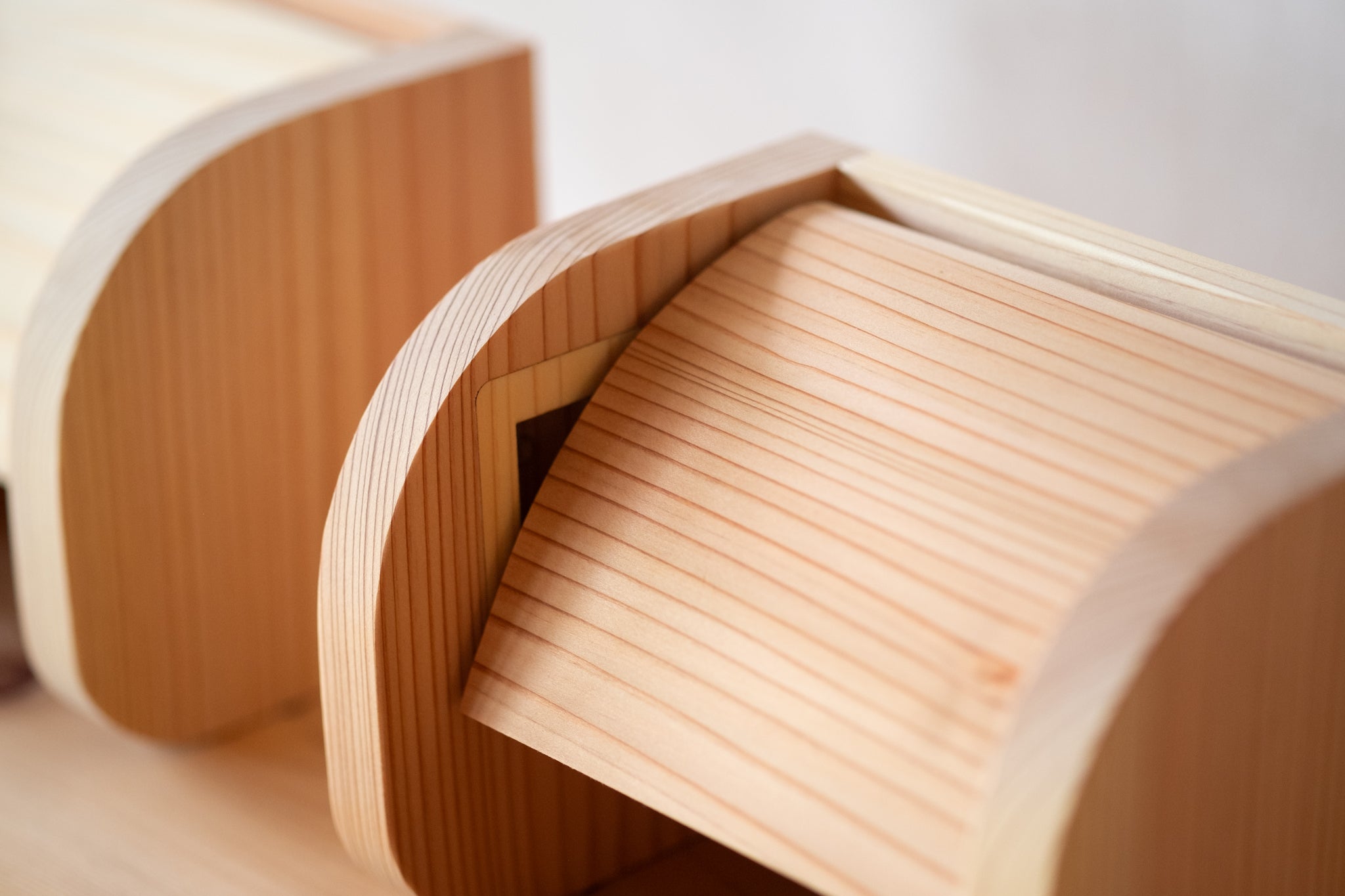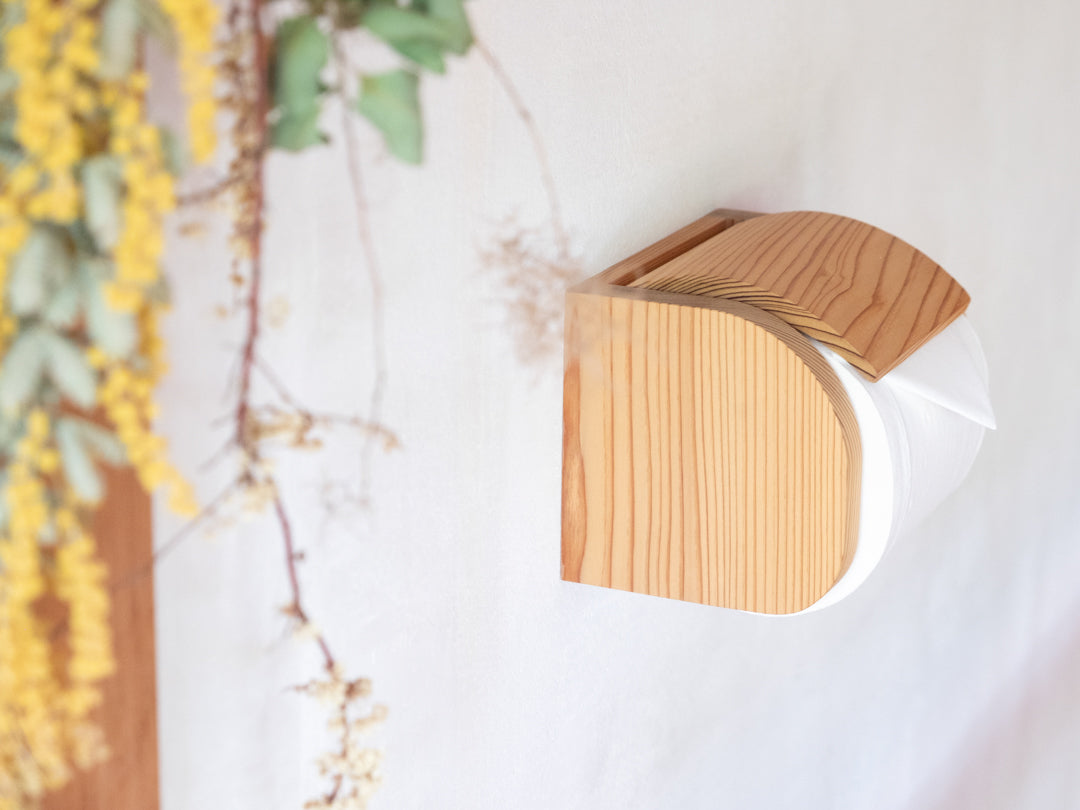 木目の美しい杉をメインに使用し、全体的に丸みを帯びたデザインにすることで木の温もりが際立ちます。小さいながらもトイレ空間の雰囲気を大きく変えてくれるアイテムです。